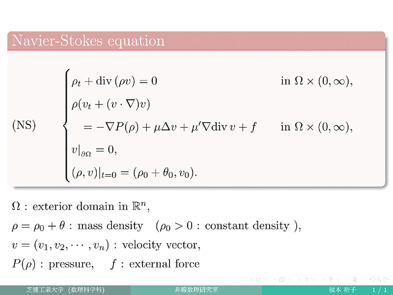 熱の伝わり方・音の伝わり方などの自然現象は、微分方程式と呼ばれる方程式で表されます。当研究室では、この微分方程式を数学的に調べる研究をしています。数式からどんな現象が起きているのかを理解し、どんな現象が起こるかを予測します。さらに、微分方程式が持つ数学的な構造を調べることを目標としています。
