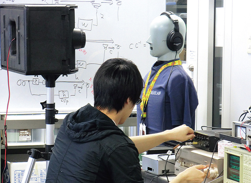 快適な音空間をつくるために、状況に合わせてパラメータを変化させるマルチチャネル適応騒音制御の実現をめざしています。閉鎖空間では音源からの直接音に反射音が重畳して複雑な信号になるため、音源位置や音響伝搬経路の計測が大切です。演算が得意なコンピュータを駆使して最適な状態を常に保つ適応制御で逆位相の音波を生成すれば、騒音を打ち消すことができます。