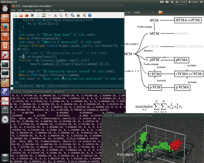 一見するとゴチャ混ぜ状態の多くのデータを、似た者同士のグループにまとめることをクラスタリング(クラスタ分析)といいます。当研究室では、人では手に負えないような大規模複雑なデータを、人が手作業で分類するような細やかさで、計算機に自動的にクラスタリングさせるために、その数理的カラクリを探りながら、新たな手法や新たな応用を研究しています。右の画像は卒業研究生のPCモニタで、当の本人は横で仮眠中です。今日も徹夜かな?