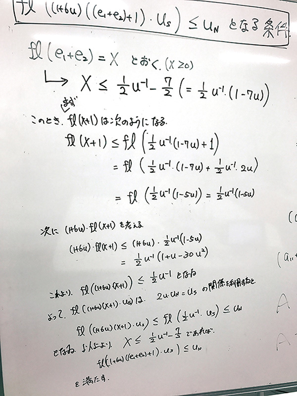 パソコンはどんなときでも正確かつ高速に計算してくれる便利な機械だと思っていませんか?高速に計算できるのは、けた数が有限な2進数で表される数値です。有限桁の数でも、計算に誤差が発生します。その誤差により、結果としてとんでもない答えが得られてしまうこともあります。当研究室では、この誤差の問題に向きあい、信頼できる結果が得られる手法の開発・実装を行います。