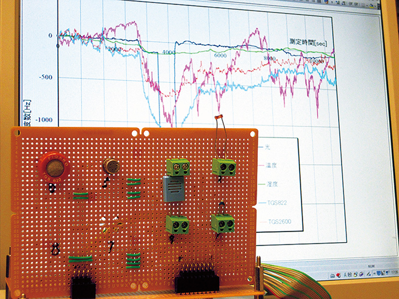 ガス(匂いの成分)を検出するセンサ、およびセンサから得られた情報を処理することによって匂いを認識するシステムを開発しています。ガスセンサの応用として、温度、湿度、光、それぞれを検出するセンサと組み合わせて居住空間内の雰囲気を計測、データ処理することで居住者の活動把握を可能とするシステム開発を行っています。ひとり暮らしのおばあちゃんの見守りや、家庭用お手伝いロボットへ提供する情報づくりに役立ちます。