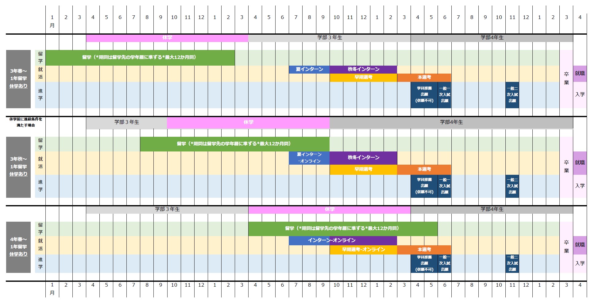 必修科目の関係で3年次の休学を伴う留学により、半期遅れの卒業が困難になることがあるかもしれません。留学を検討されている学生は、履修指導学年担当の先生へ早めにご相談ください。