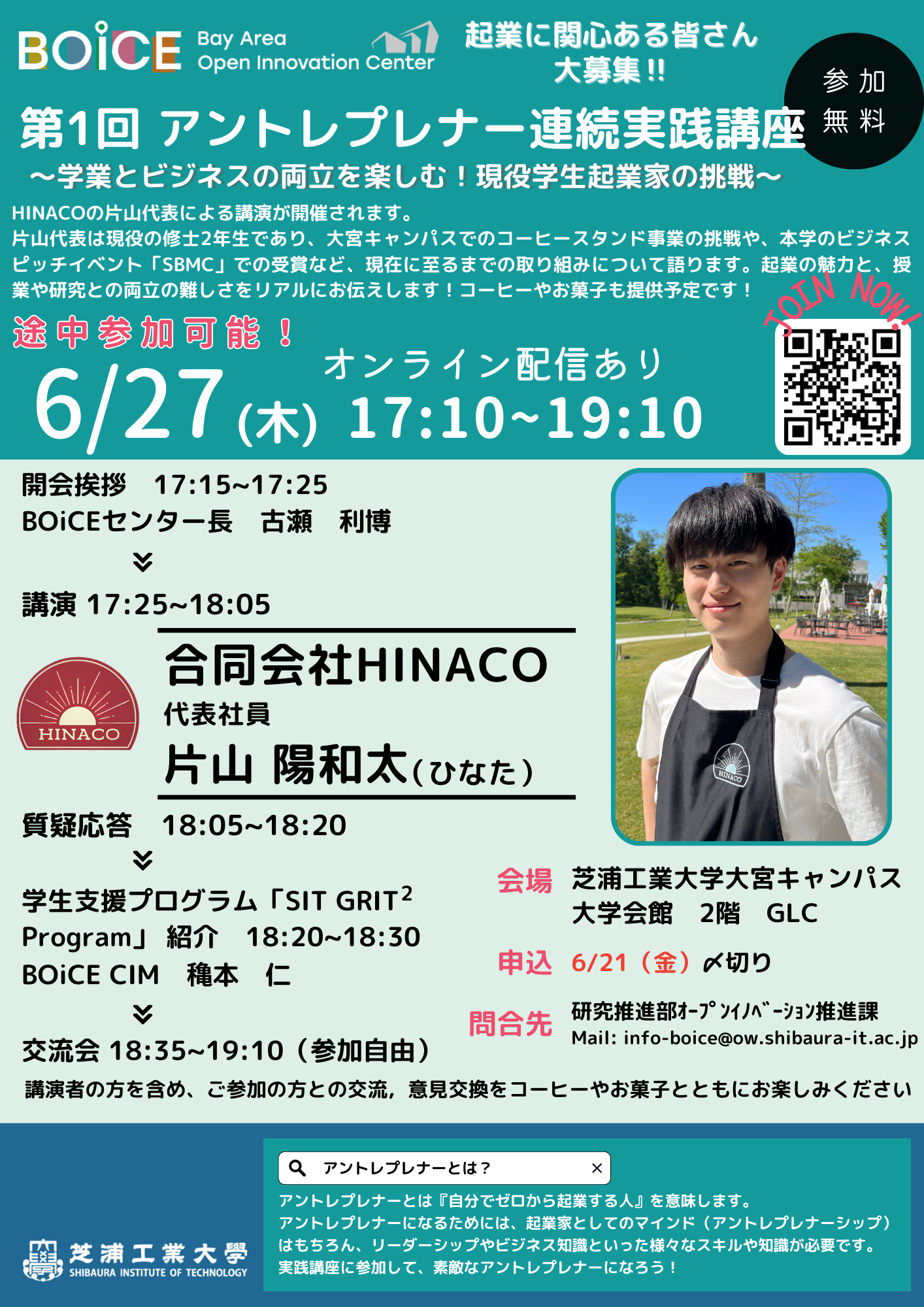 2024年度連続実践講座の第1回目では、大宮キャンパスでコーヒースタンド事業を行っているHINACOの片山代表から、本学独自のビジネスピッチイベント「SBMC」での受賞から事業がスタートした現在に至るまでの取り組みについてご講演いただきます!HINACOの片山代表は、本学の修士2年生でもありますので、起業の魅力や授業や研究との両立の難しさなど、楽しさと辛さの両面について、現役学生ならではの視点で語っていただきます。
