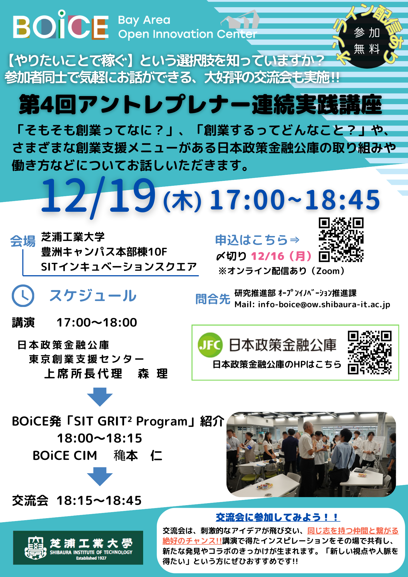 | 18:00-18:15 | BOiCE発学生支援プログラム「SIT GRIT² Program」紹介 | BOiCE チーフインキュベーションマネージャー 穐本 仁 |