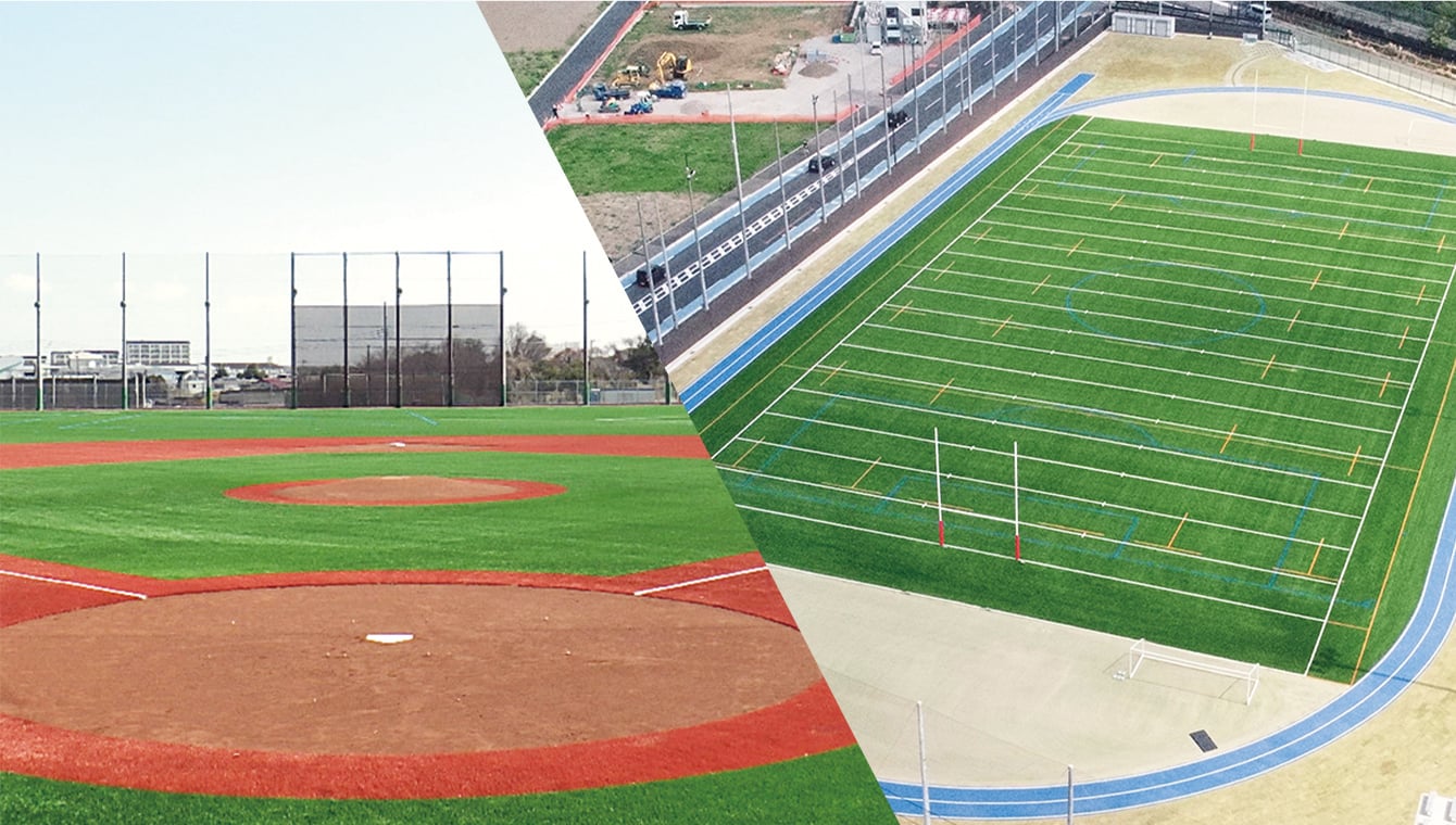 종합그라운드는 인공잔디 운동장과 테니스코트 10면으로 구성돼 야구, 축구, 테니스, 골프, 러닝 등에 사용됩니다.