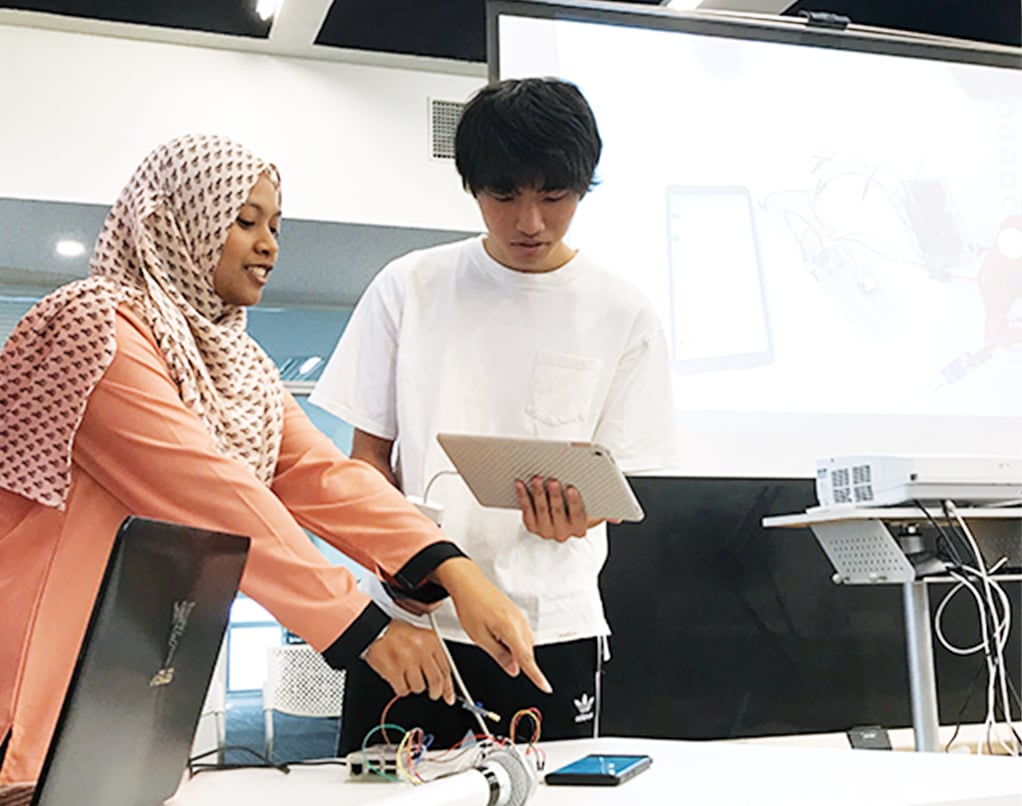 기업이나 지역과 실제로 연계해 과제를 해결하면서 실천적인 인재를 육성하는 교육을 추진하고 있습니다. 기업이나 지역의 과제가 어떤 사업성을 가지고 있는지 알아보고 어떻게 사회에 공헌할 수 있을지 고민하면서 아이디어와 기술을 조합해 기획과 입안에 나섭니다. 그리고 프로토타입을 만들어 실제로 제안하는 단계로 나아갑니다. 대학원생을 중심으로 팀의 성과를 발표하는 자리도 마련돼 있습니다.