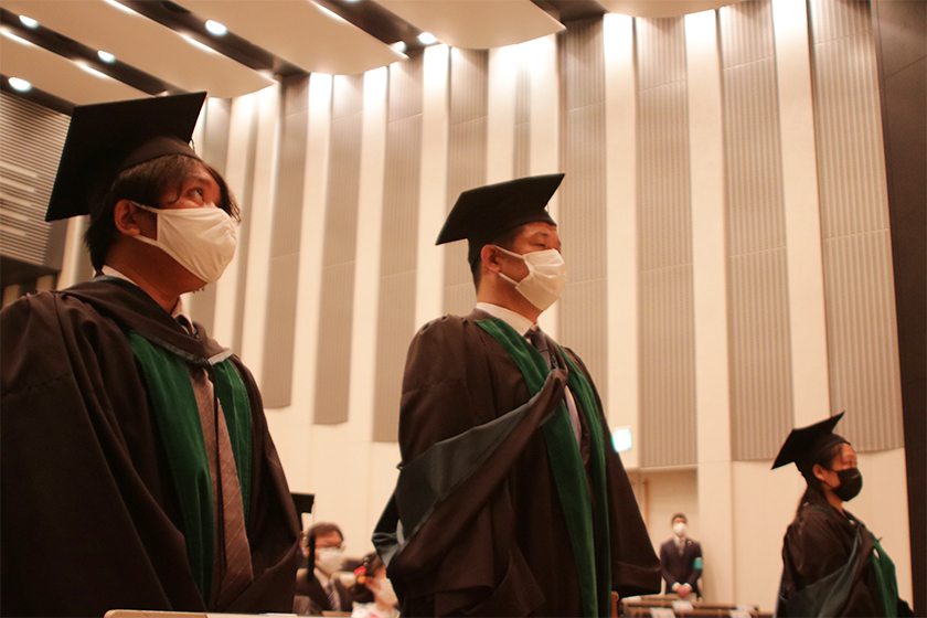 9월 22일, 도요스캠퍼스에서 거행된 가을 학위기 수여식이 관계자를 대상으로 생중계됐습니다. 감염증 예방대책을 위해 졸업생 본인만 자리했지만, 가족도 부담없이 생중계를 지켜보면서 박사과정 수료자 11명, 석사과정 24명, 학부 25명의 새로운 출발을 축하했습니다.