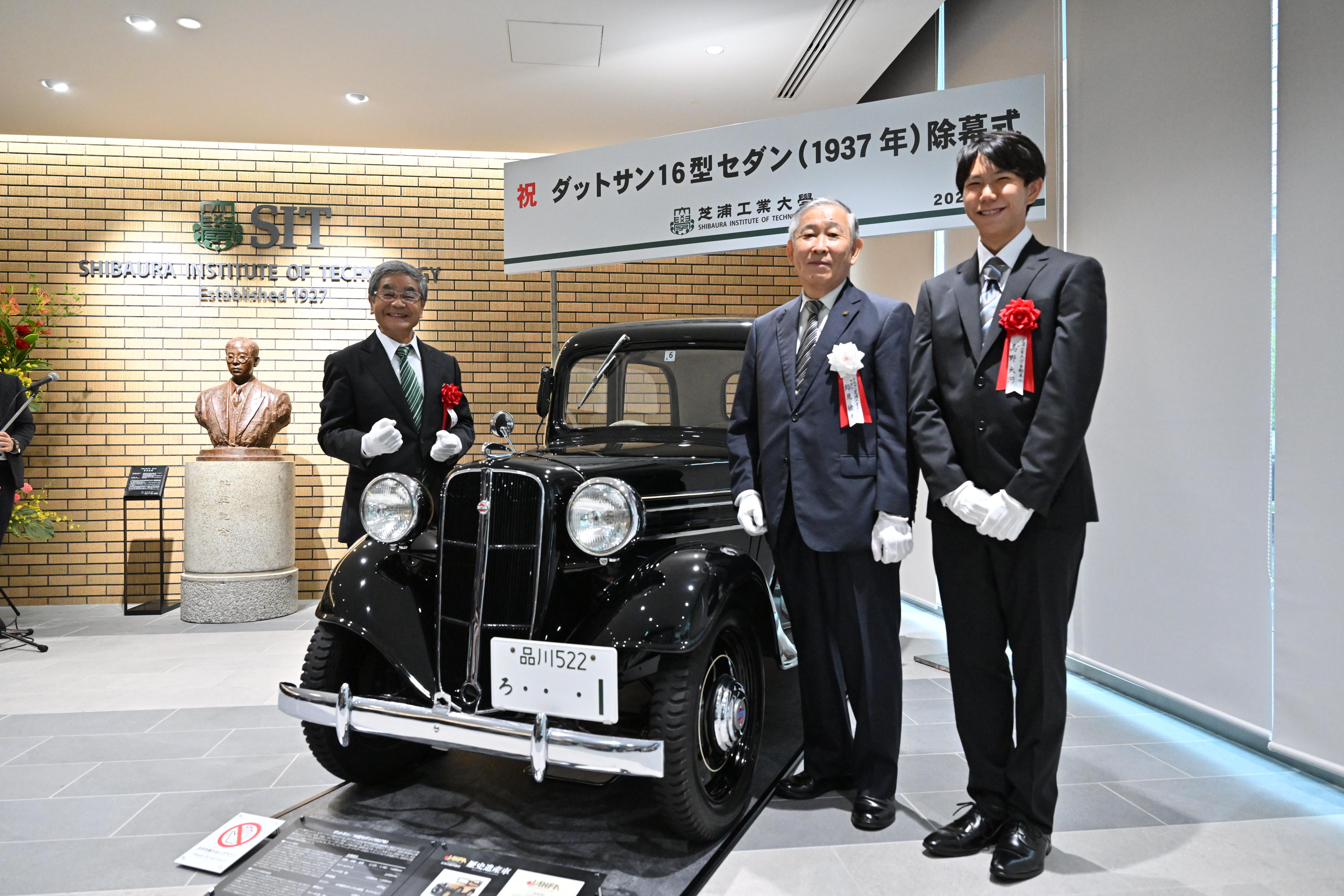 장소를 본부동 1층 입구로 옮겨 ‘닷선16형세단(1937년)’ 제막식을 개최했습니다. 기증자이자 기계공학과 졸업생인 사사키 도쿠지로 씨가 축사를 한 후 자동차부 주장과 기념 촬영을 했습니다.